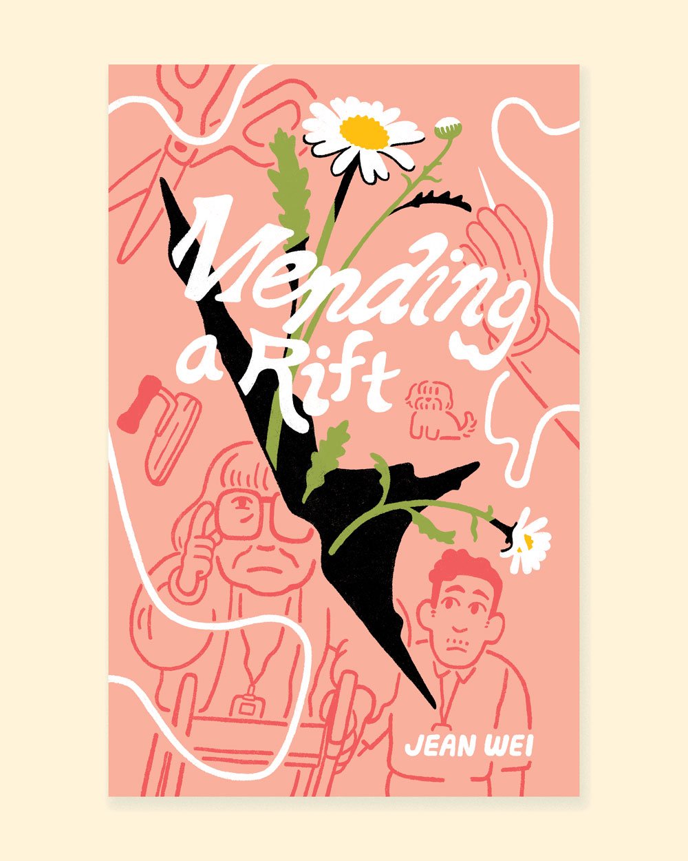 The poster for the 2023 ShortBox Comics Fair, illustrated by Jean Wei. The central image resembles a comic book cover, with an anthropomorphic fig in the center, but it’s being pushed back by a hand with a green ring opening the book from the inside; three humans, one of them with a sword and a yellow backpack, emerge from the book, as well as a black tabby cat, a green snake, a purple tulip, a comet, and a broken egg.