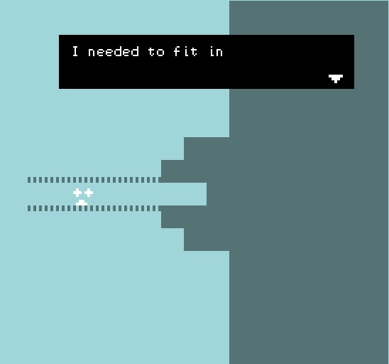 A screenshot from the video game “The Mold” by Zhanko. It shows a white, abstract pixelated figure on a teal bridge-like structure with a square crevice. The black text box on top of the screen reads: “I needed to fit in”.