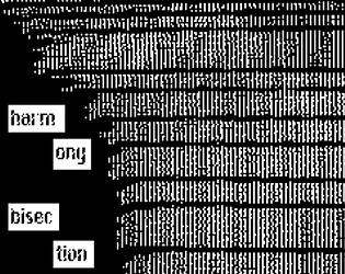 Promotional art for the interactive fiction “Harmony Bisection” by Air Gong. It depicts the game’s title, with each word cut in half. Next to the words is an abstract black and white pixelated image that looks like it has several lines cut through it.